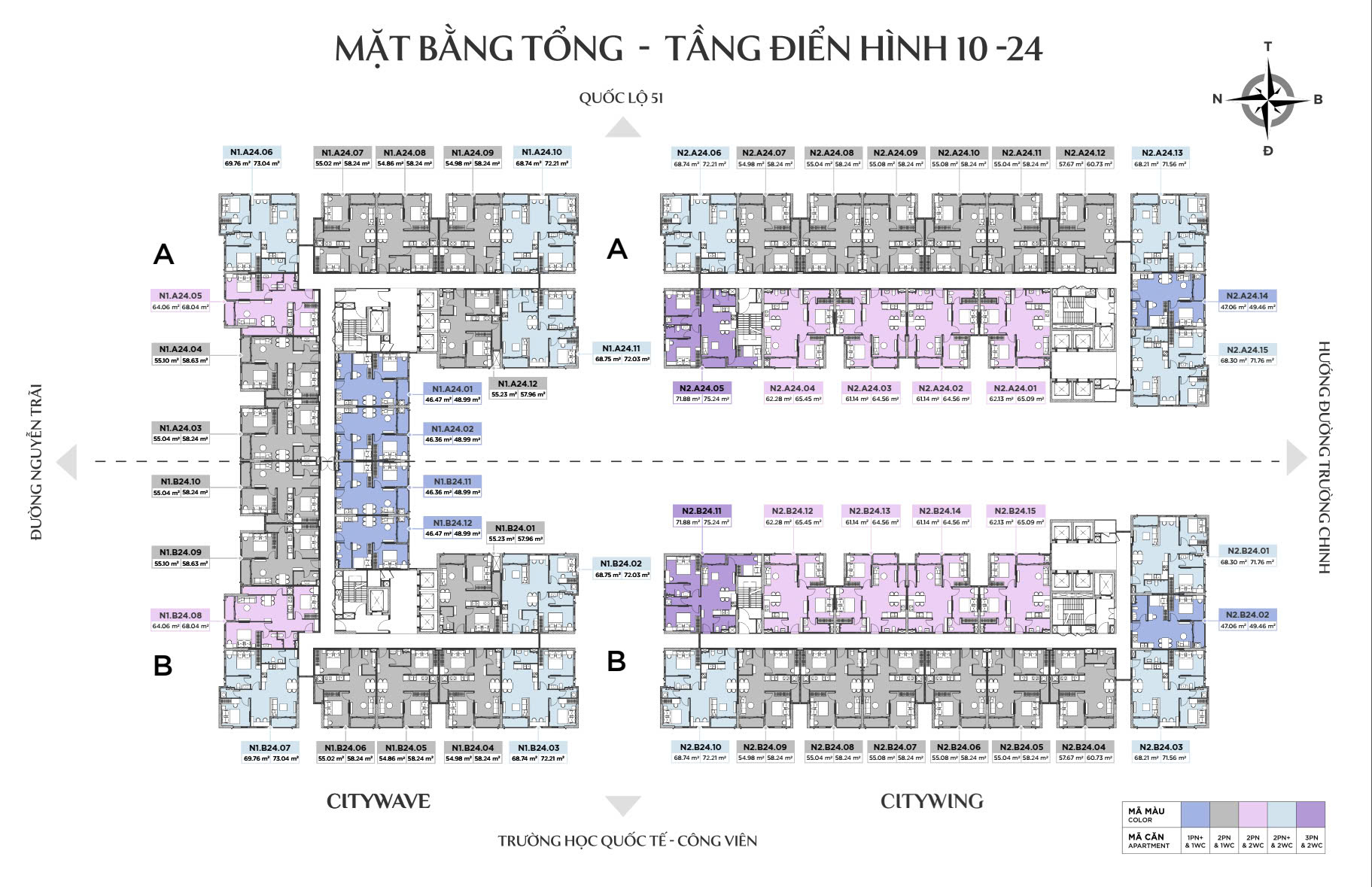 - Căn 2PN 2WC+: 68,73 m², thêm không gian linh hoạt.