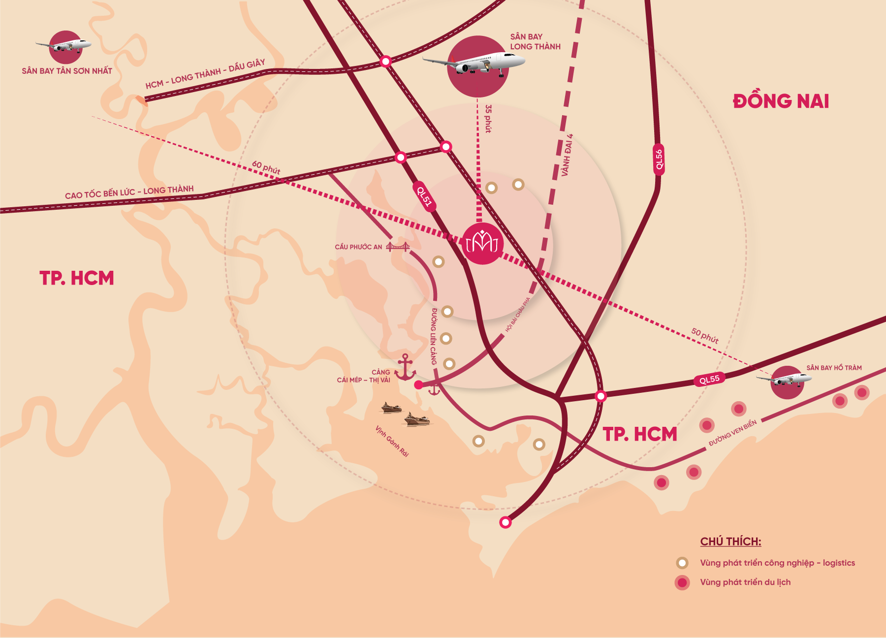 Từ Maison Grand, hệ thống giao thông hiện đại giúp kết nối nhanh chóng: cao tốc TP. HCM – Long Thành – Dầu Giây chỉ 45-60 phút đến Sài Gòn, cao tốc Biên Hòa – Vũng Tàu và Bến Lức – Long Thành sắp hoàn thành, cùng sân bay quốc tế Long Thành cách 30 phút. Các khu công nghiệp lớn trong bán kính 5-20 phút, kết hợp với sự phát triển đô thị hóa cao tốc, khiến Maison Grand trở thành lựa chọn lý tưởng cho chuyên gia quốc tế và gia đình trẻ – đối tượng chính cho thị trường căn hộ cho thuê Phú Mỹ.